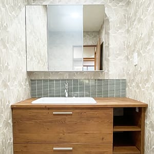 中古戸建のフルリノベーションに伴う洗面台リフォームを施工。TOTOドレーナを採用し、木目調キャビネットとボタニカルデザインでナチュラルで温かみのある洗面空間へ。