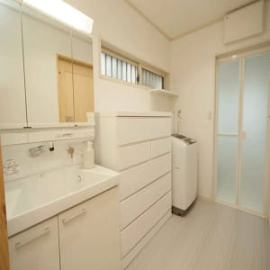 中古戸建のフルリノベーションに伴う洗面台リフォームを施工。TOTOドレーナを採用し、木目調キャビネットとボタニカルデザインでナチュラルで温かみのある洗面空間へ。
