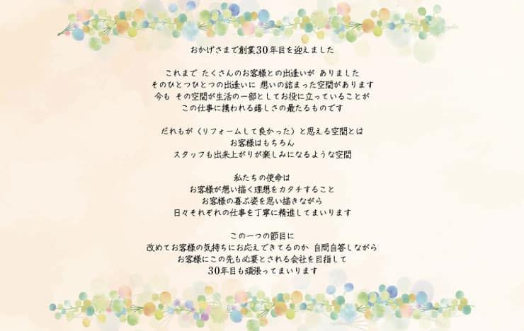 | 営業内容 | 注文住宅の設計・施工 増改築、リフォーム、水廻り工事、耐震リフォーム、防犯リフォーム、シックハウス対策工事 中古全面リフォーム、マンション全面リフォーム、リノベーション、キッチンリフォーム、お風呂リフォーム、トイレリフォーム、耐震補強リフォーム、光触媒、竹炭塗料、バリアフリーリフォーム、外壁・屋根リフォーム、エクステリア、サッシ、防音工事 |