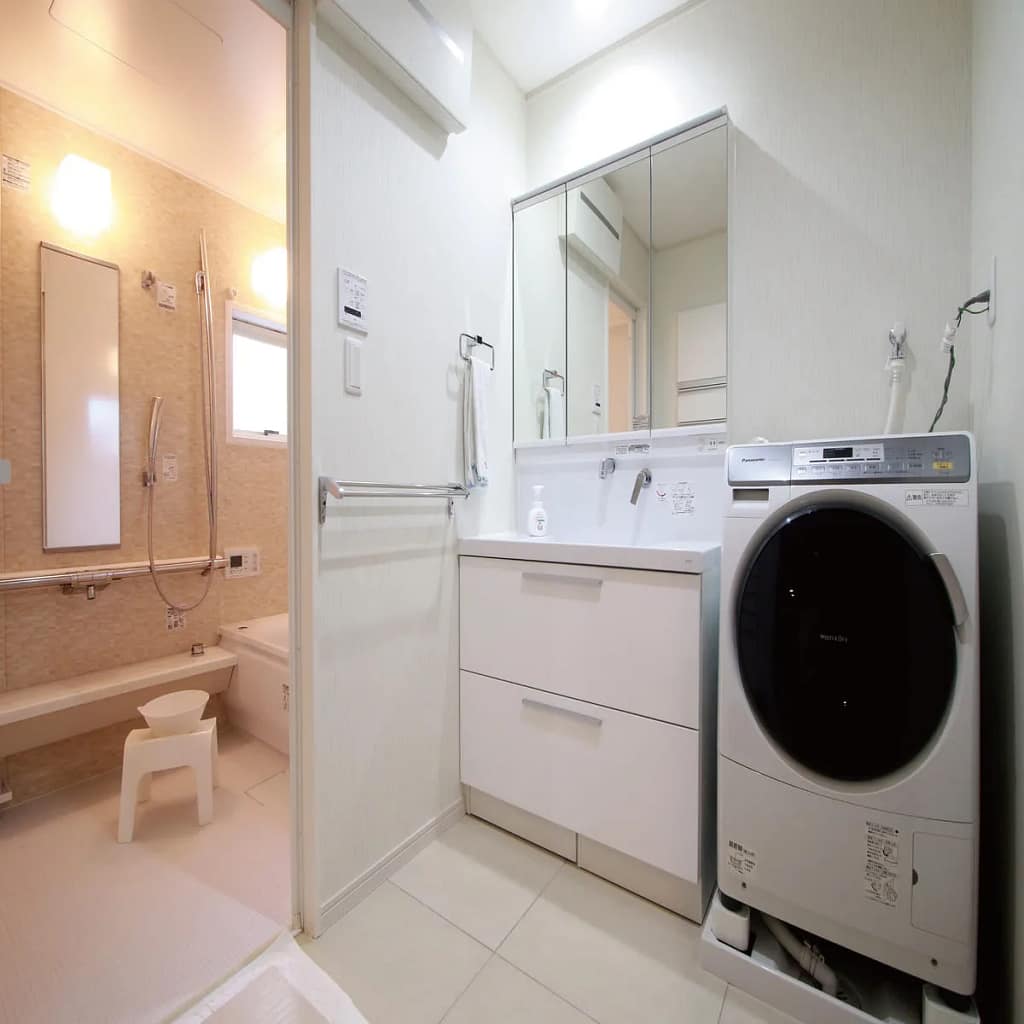 清潔感のある洗面脱衣室。小物もスッキリ収納できるよう、間取り変更をして収納部分を造りました。