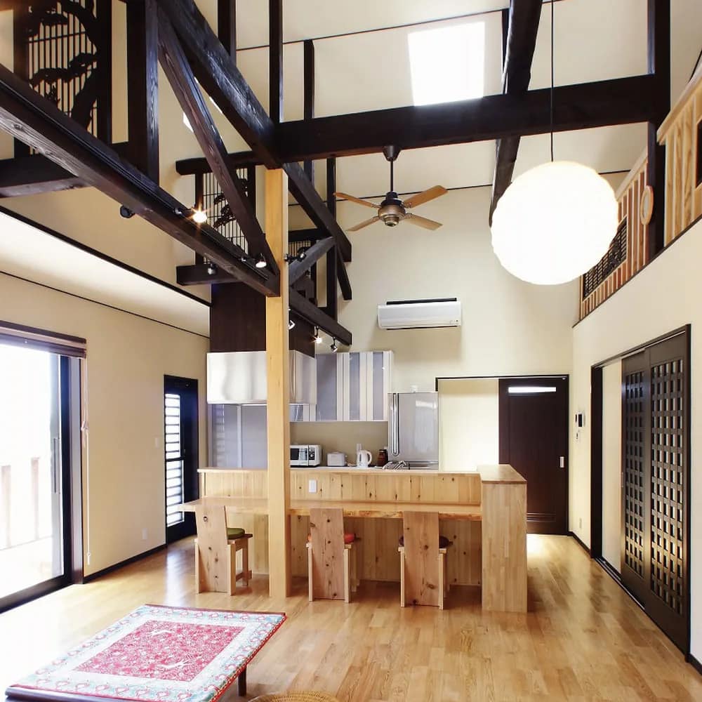 天井裏で見つけた梁を活かしたリビングダイニングは