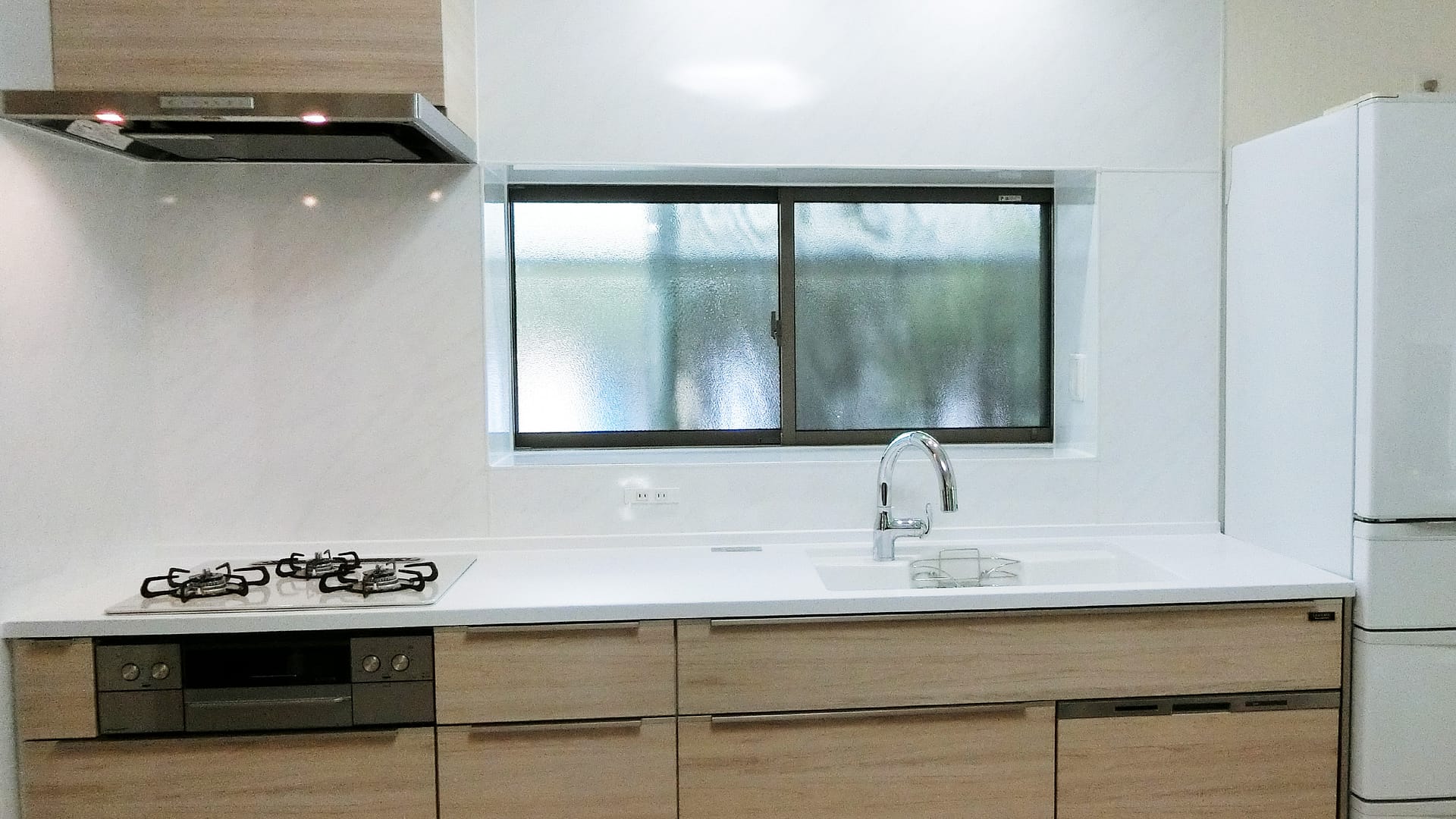 元の窓枠とレンジフード横の線を揃え、空間の美しさを確保
