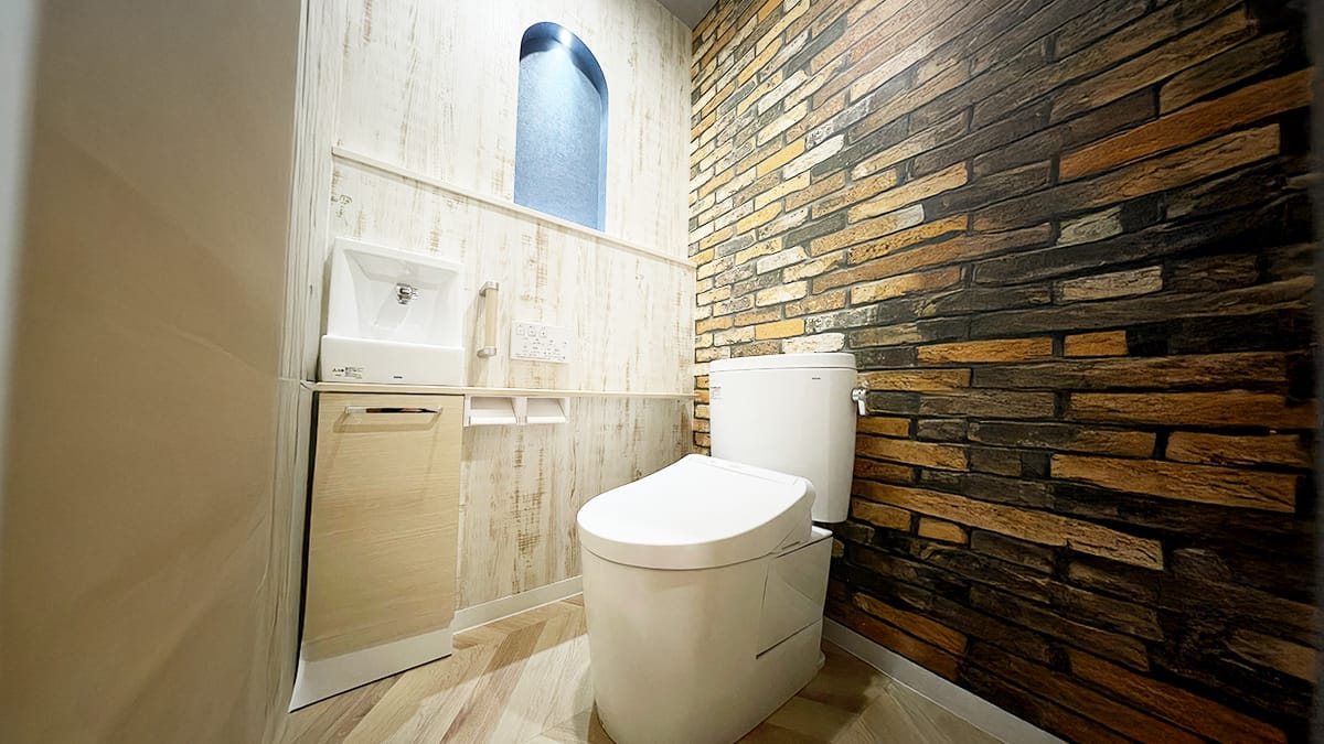 【福岡市西区】トイレリフォーム:レンガ調アクセントクロスで上質な大人カジュアル空間へ